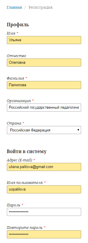 На странице регистрации необходимо заполнить все поля в разделах «Профиль» и «Войти в систему».