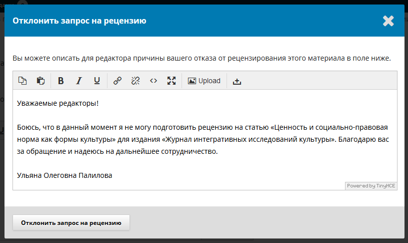 До истечения срока ответа вам нужно дать согласие на подготовку рецензии или отклонить запрос редакции. Вы можете отправить редактору стандартное сообщение или вписать свой текст письма.