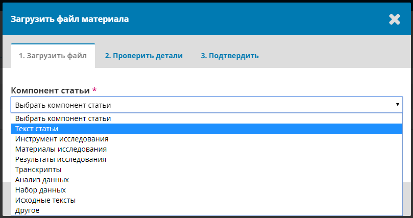 При загрузке файла в списке «Компонент статьи» нужно выбрать «Текст статьи». Пожалуйста, используйте для названия файла фамилию автора или первых двух соавторов в записи латиницей (например, «streltzov.docx»). После загрузки вы можете переименовать файл или загрузить вместо него другой.