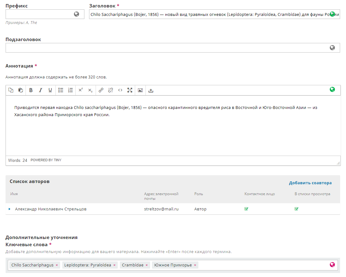Если загружается статья на русском языке, заполняются два параллельных поля в каждом разделе: для русского и английского текста. Если статья написана на английском языке, заполняется только поле для английского текста. Для статей на немецком или французском языке вводятся метаданные на соответствующем языке и на английском.