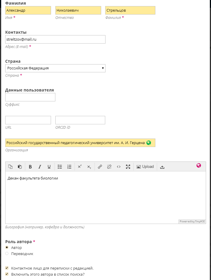 Для каждого соавтора нужно указать имя, отчество и фамилию, e-mail, страну и организацию. Внизу необходимо выбрать роль «Автор».