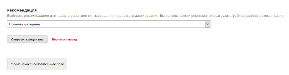 • В поле «Рекомендация рецензента» вы выражаете свое мнение о том, следует ли принять, направить на доработку или отклонить статью. Эта рекомендация затем включается в сообщение для автора.